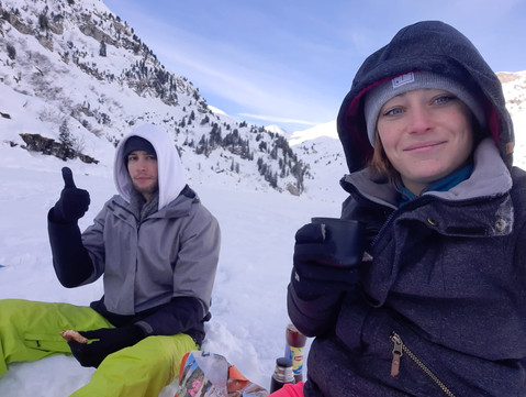 Gegen Mittag hatten wir bereits eine 3/4-Runde um den See abgespult, als ich endlich die ersten Fische auf dem völlig vereisten Echolot ausmachen konnte. Und gleich nach wenigen Minuten hatte ich einen Biss auf die neuen Tubejigs! Nach einigen Sekunden konnte sich der Namay abschütteln, doch schon wenige Augenblicke später biss er erneut und ich konnte einen gut genährten 40er-Namay aus dem Loch drillen. Die Kälte war auf einmal wie weggeblasen und die Motivation wieder riesig (nicht, dass sie dies einmal nicht gewesen wäre...). Schliesslich wärmten wir uns mit einer leckeren Suppe und heissem Tee (der Eistee verkam leider zu einem Eisklumpen), doch lange konnte mich das Zmittag nicht vom Fischen abhalten. Immer wieder hatten wir bei diesem Spots "Marks" auf dem Echolot, doch waren die Fische äusserst zickig wie es schien. Schliesslich war es Olivia, die plötzlich jubelte und den nächsten Fisch im Drill hatte. Nach knackiger Gegenwehr musste sich auch dieser #Namaycush geschlagen geben. Zwar nicht ganz so dick wie meiner, aber auch an der Grenze zu 40 cm! Yes, ich sag euch, die Frau ist ein Hauptgewinn!